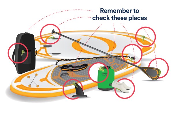Check your paddleboard, clothing and footwear after leaving the water for mud, aquatic animals, or plant material. Remove anything you find and leave it at the site.