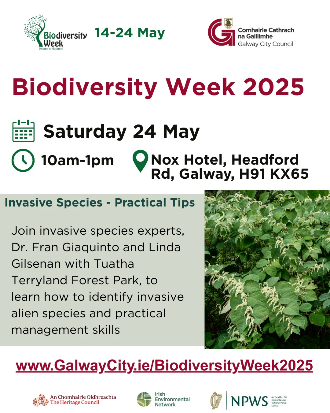 Nox Hotel Headford Rd, GalwayJoin invasive species experts, Dr. Fran Giaquinto and Linda Gilsenan with Tuatha Terryland Forest Park, to learn how to identify invasive alien species and gain practical management skills. Time: 10am-1pm Location : Meet at Nox Hotel, Headford Rd, Galway, H91 KX65 Contact: [email protected]